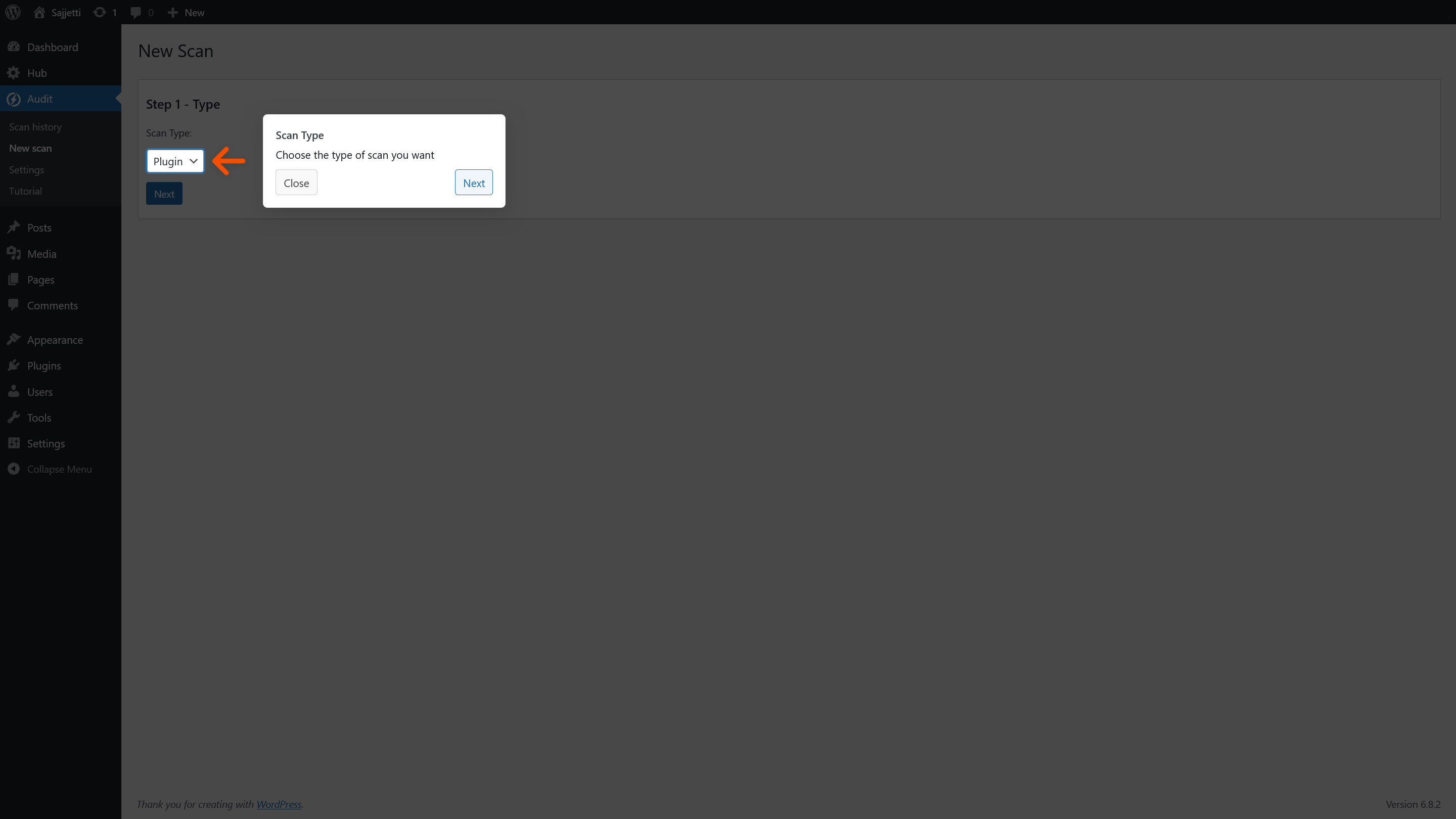 Tutorial step: Step 1 – choose scan type (Plugin/Theme) (overlay with arrow).