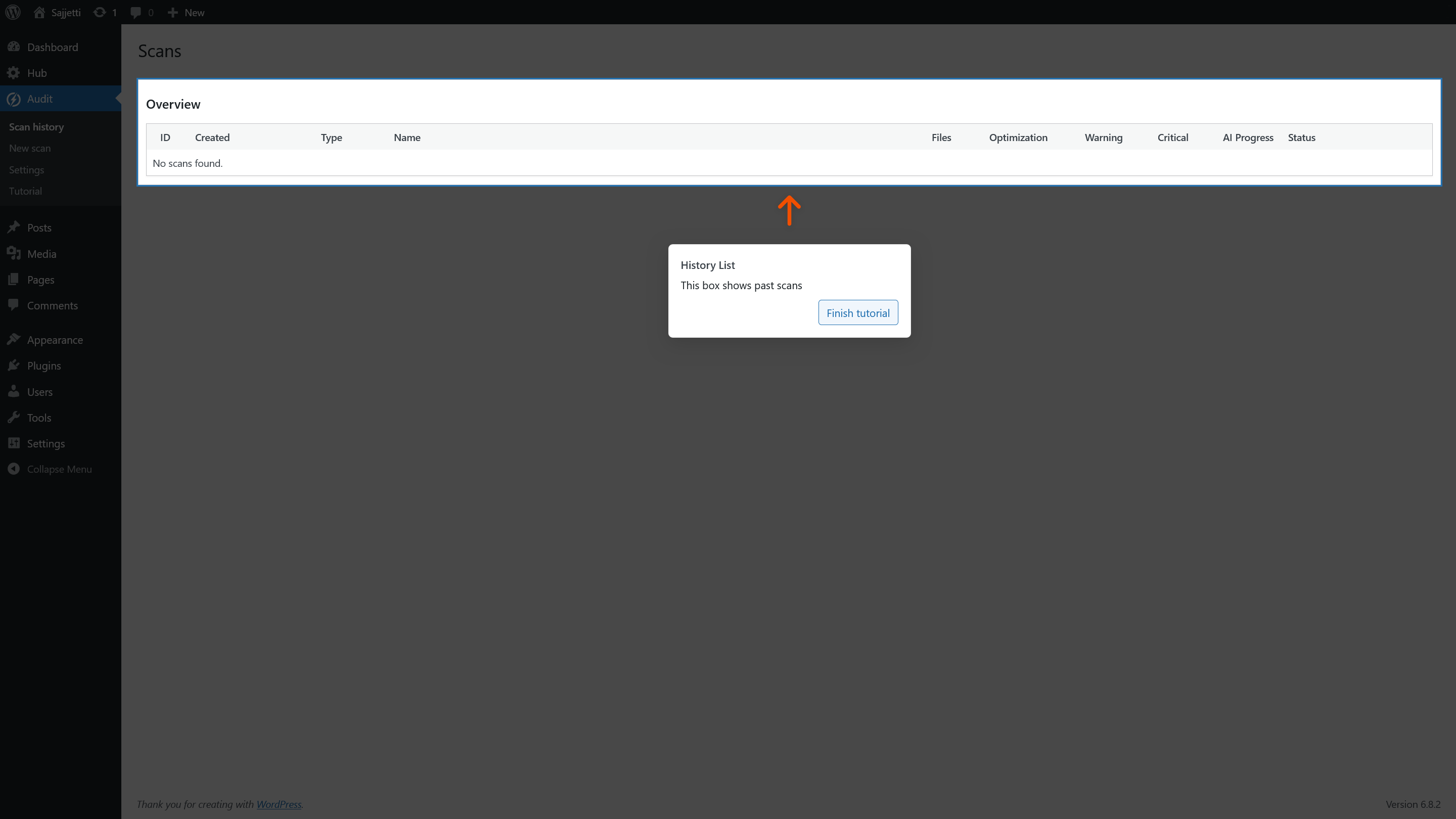 Tutorial step: Scan history – overview (no scans yet) (overlay with arrow).